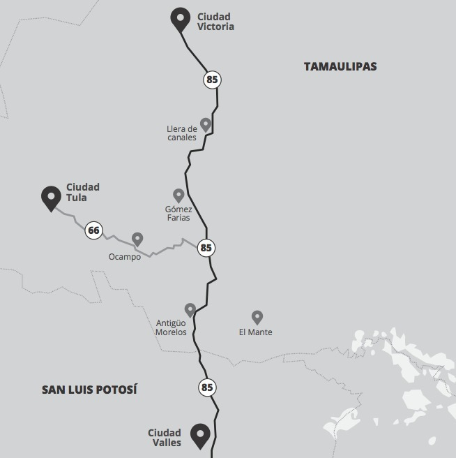 Cuando Graciela habla de la parte “sur de Tamaulipas” se refiere, en específico, a la zona de El Mante y algunas localidades y municipios vecinos conectados por la carretera federal 85 -tramo de El Mante, pasando por Gómez Farias hasta Llera de Canales-, así como los caminos y brechas que atraviesan esta autopista federal, como la carretera estatal 66, que cruza Ocampo y llega hasta Ciudad Tula; o la carretera estatal 116, que topa en el municipio de Xicoténcatl.